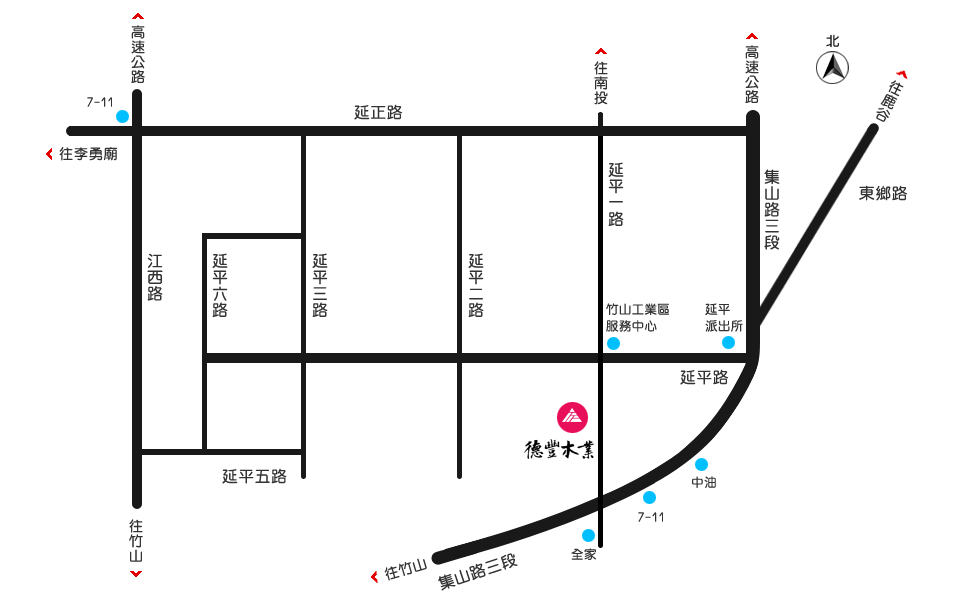 • (B)南下/北上國道3號→下243竹山交流道→第一個紅綠燈右轉→接東埔蚋橋→右轉接江西路直行→於7-11竹寶門市(位於右手邊)左轉延正路→右轉延平一路後直行→抵達德豐木業(位於右手邊)